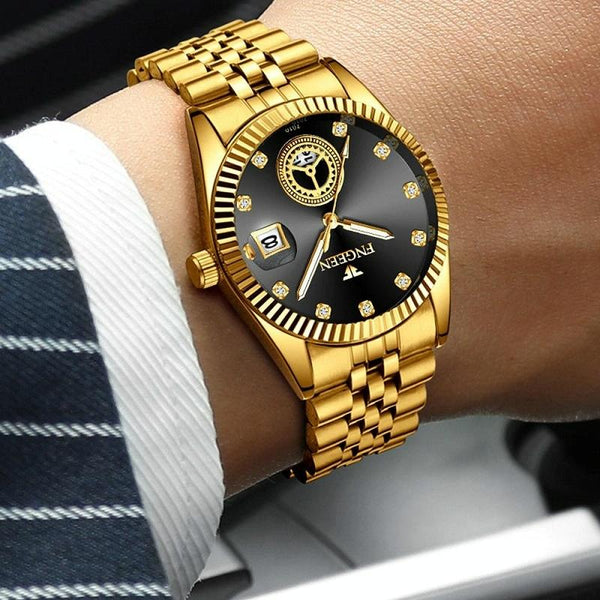 FNGEEN 7010 Middle-Aged and Elderly Men Luminous Calendar Quartz Watch(All Gold Black Sueface)