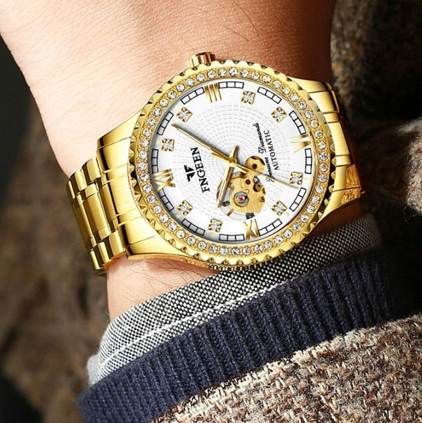 FNGEEN 8073 Men Automatic Mechanical Watch Diamond Hollow Fashion Watch(Full Gold Black Surface)