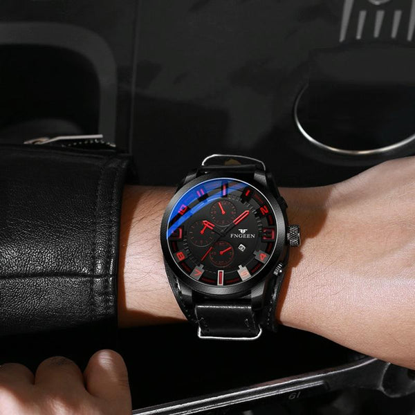 FNGEEN P1010 Men Fashion Large Dial Leather Belt Watch Student Casual Quartz Watch(Black Leather With Red Words)