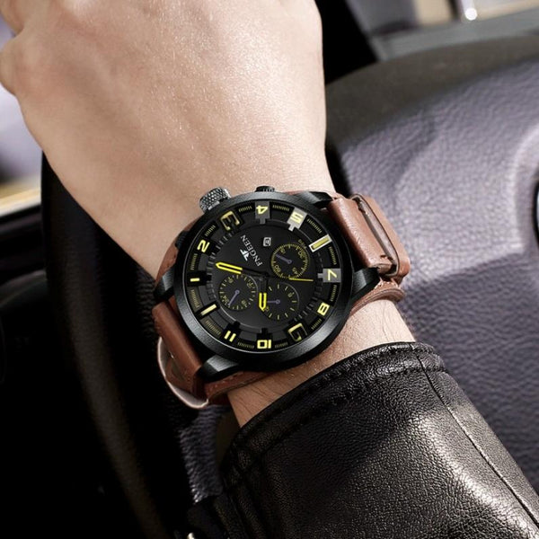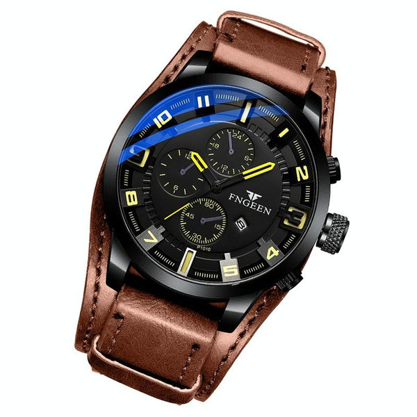 FNGEEN P1010 Men Fashion Large Dial Leather Belt Watch Student Casual Quartz Watch(Light Brown Leather With Yellow Words)