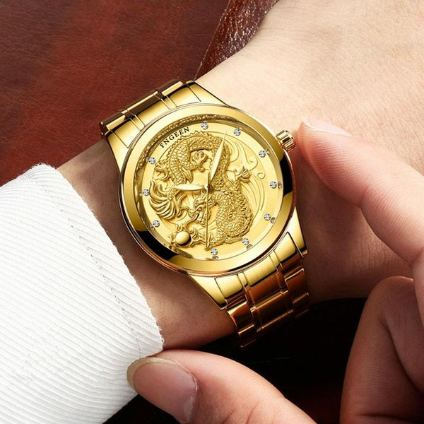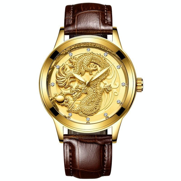 FNGEEN S666 Waterproof Luminous Watch Quartz Ultra-Thin Dragon Or Phoenix Pattern Couple Watch(Brown Leather Full Gold Golden Surface)