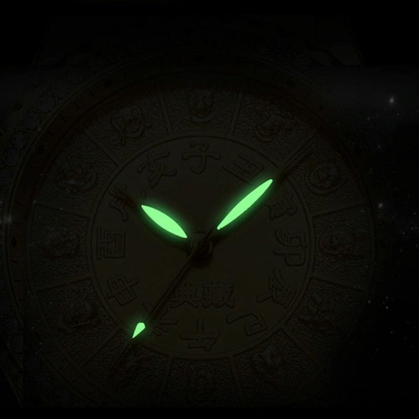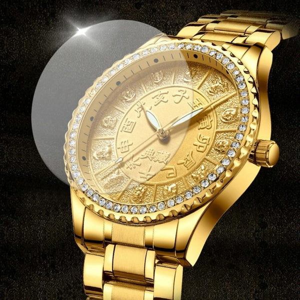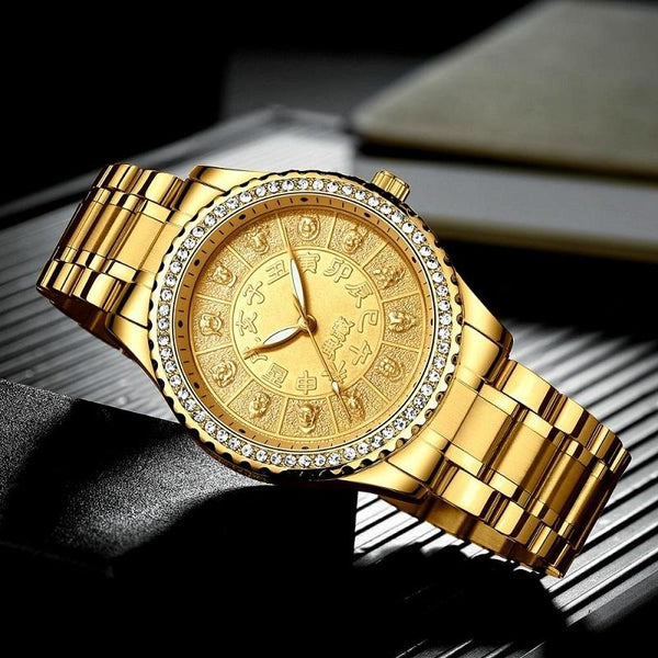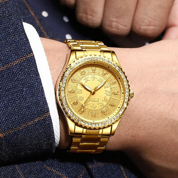 FNGEEN S777 Men Gold-Plated Diamond Zodiac Pattern Quartz Watch(Leather Brown Belt)
