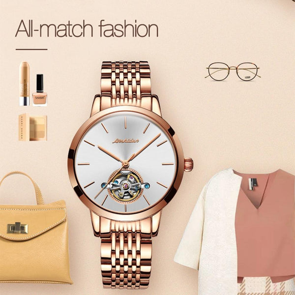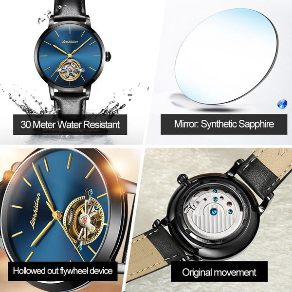 JIN SHI DUN 8812 Women Simple Hollowed Waterproof Automatic Mechanical Watch(Black Leather Strip Blue)