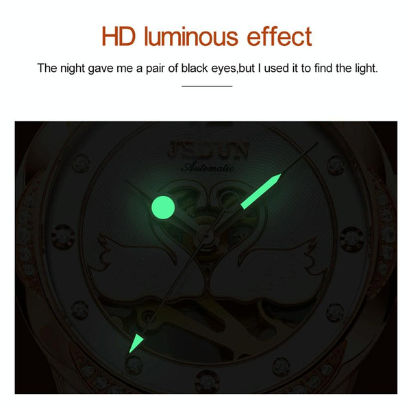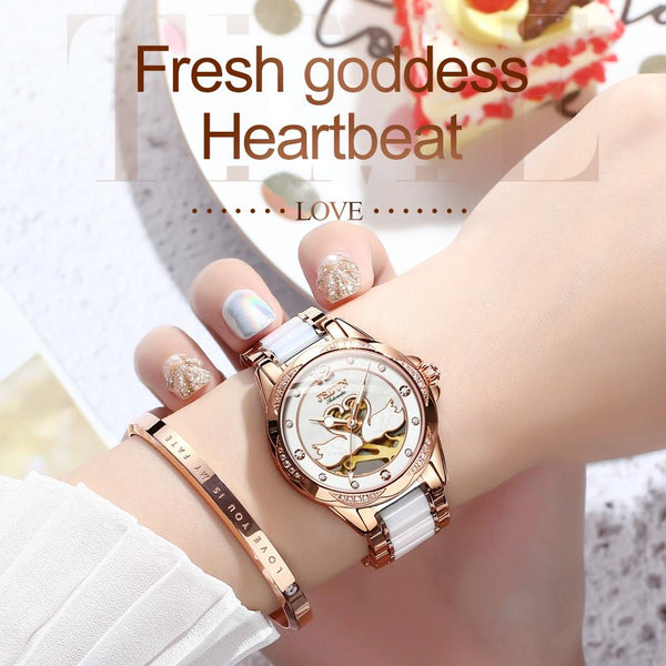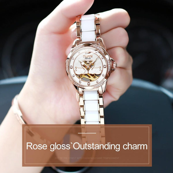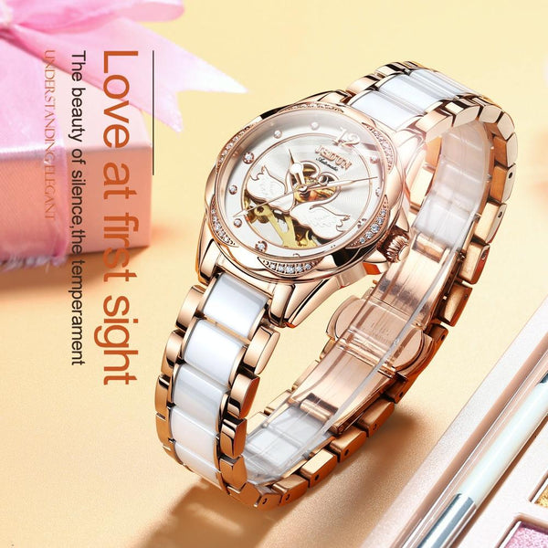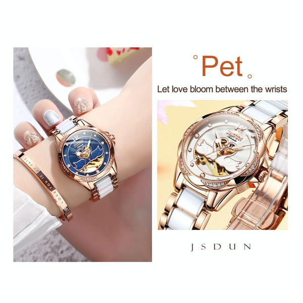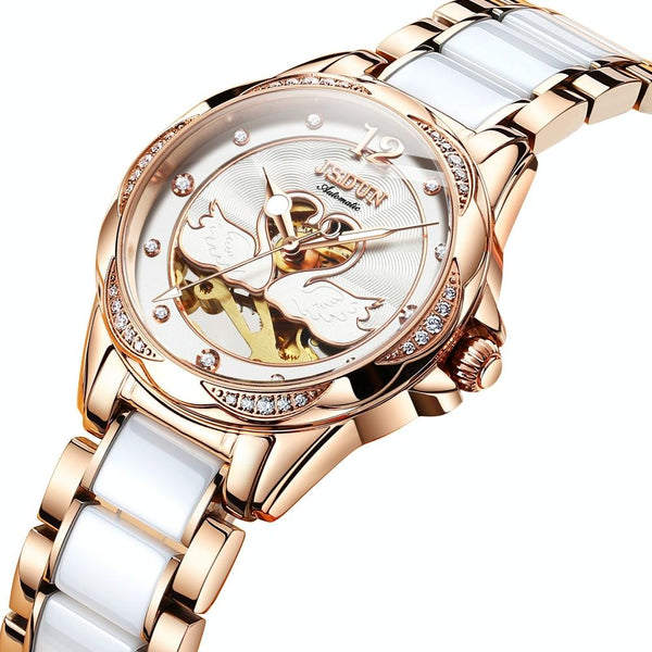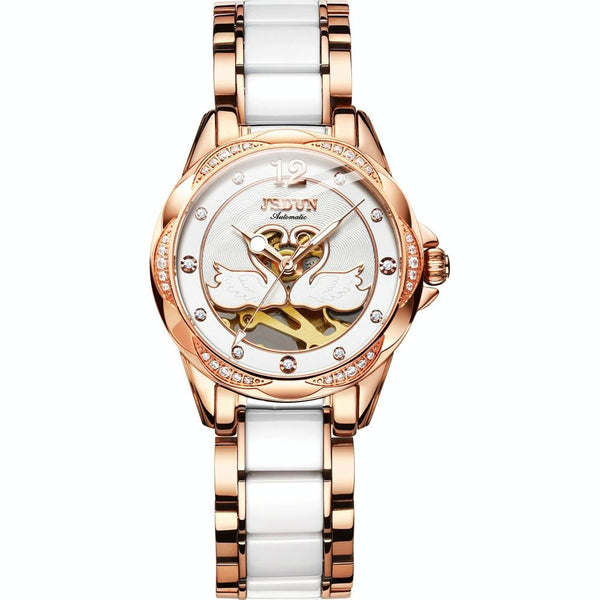 JIN SHI DUN 8831 Women Fashion Diamond Hollowed Waterproof Ceramic Mechanical Watch(White)