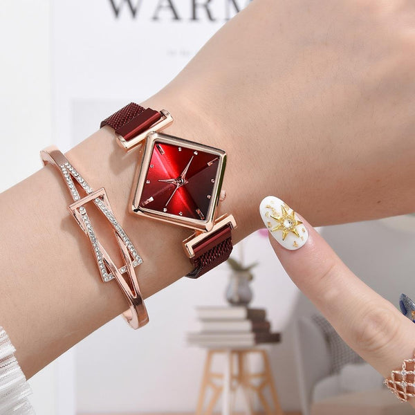 Ladies Diamond Dial Quartz Watch, Colour: Red + Bracelet