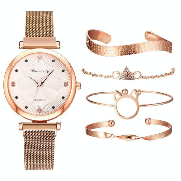 Ladies Magnet Buckle Watch Casual Flower Dial Watch Alloy Mesh Quartz Watch(Gold White+Bracelet)
