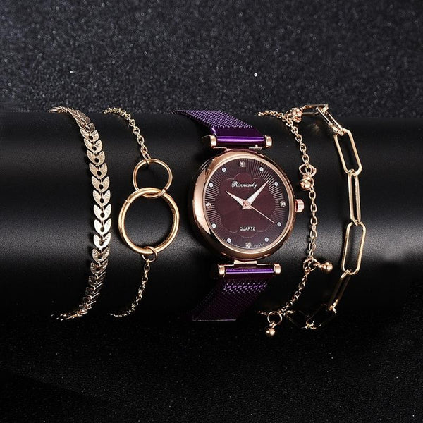 Ladies Magnet Buckle Watch Casual Flower Dial Watch Alloy Mesh Quartz Watch(Purple+No.1 Bracelet)