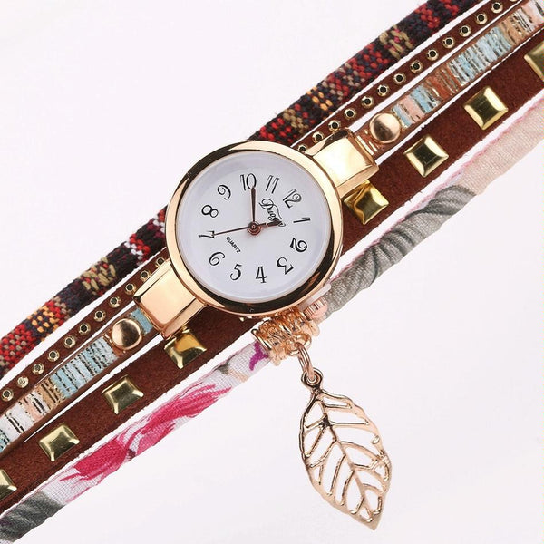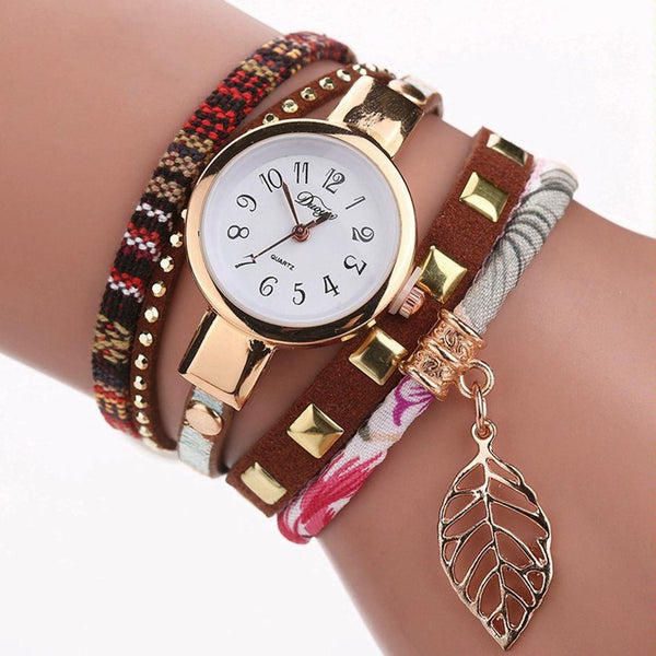 Ladies Quartz Bracelet Watch with Leaf Shape Pendant(Brown)