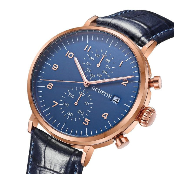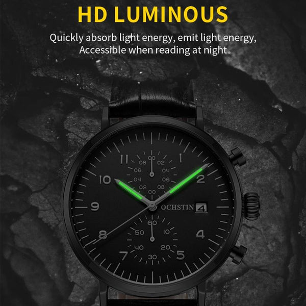 Ochstin 5076D Multifunctional Business Leather Waterproof Luminous Quartz Watch(Black+Black)