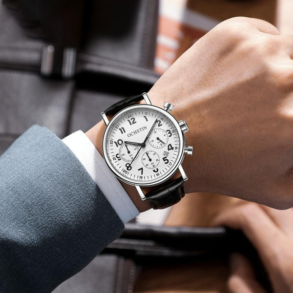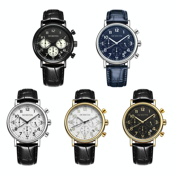 Ochstin 5081A Multifunctional Luminous Waterproof Leather Strap Quartz Watch(Silver+Blue+Blue)