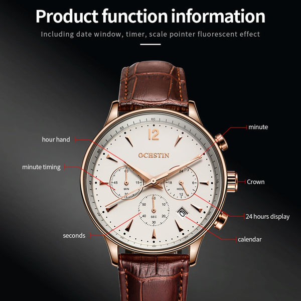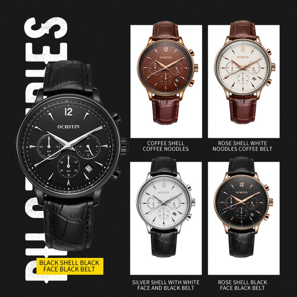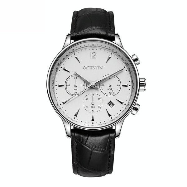Ochstin 6050A Multifunctional Quartz Men Leather Watch(Silver+Black)