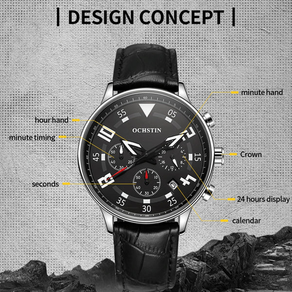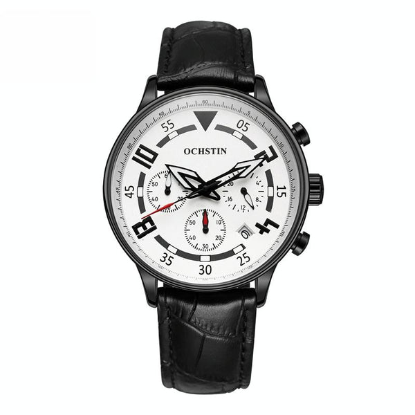 Ochstin 6050B Multifunctional Quartz Men Leather Watch(Black+White+Black)