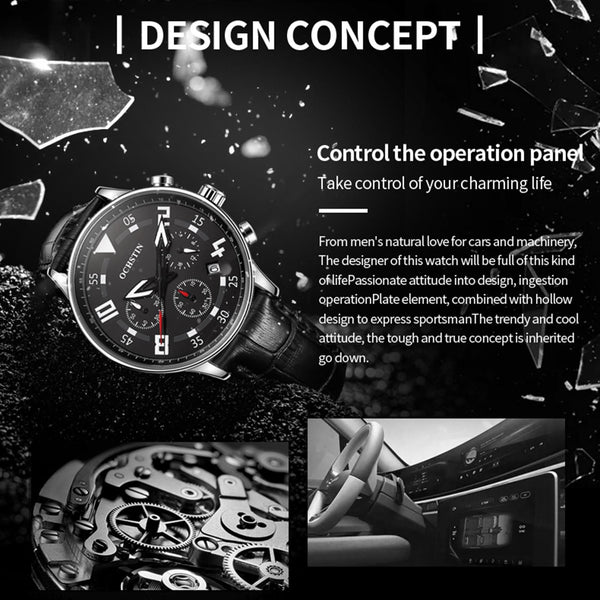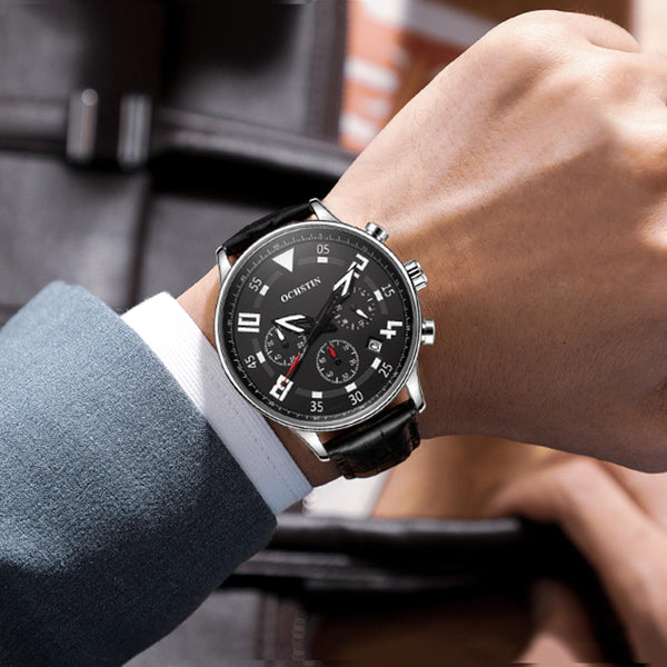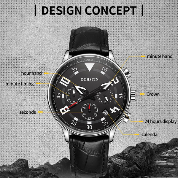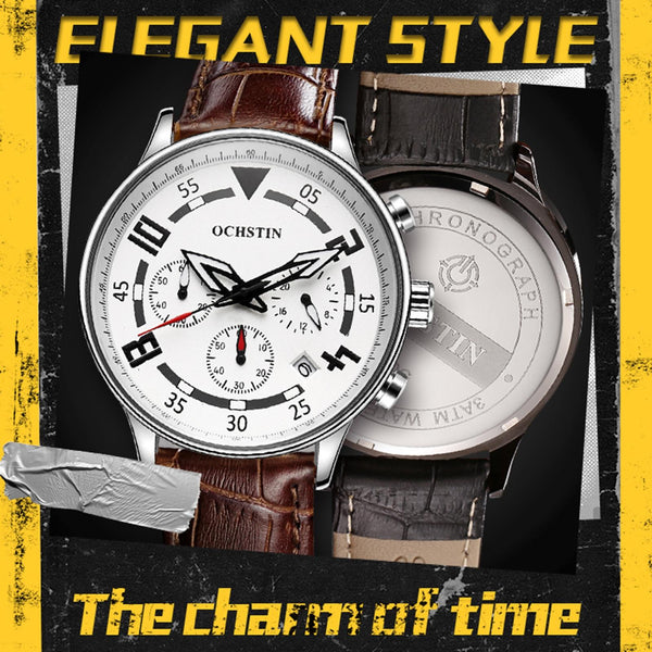Ochstin 6050B Multifunctional Quartz Men Leather Watch(Silver+Coffee)