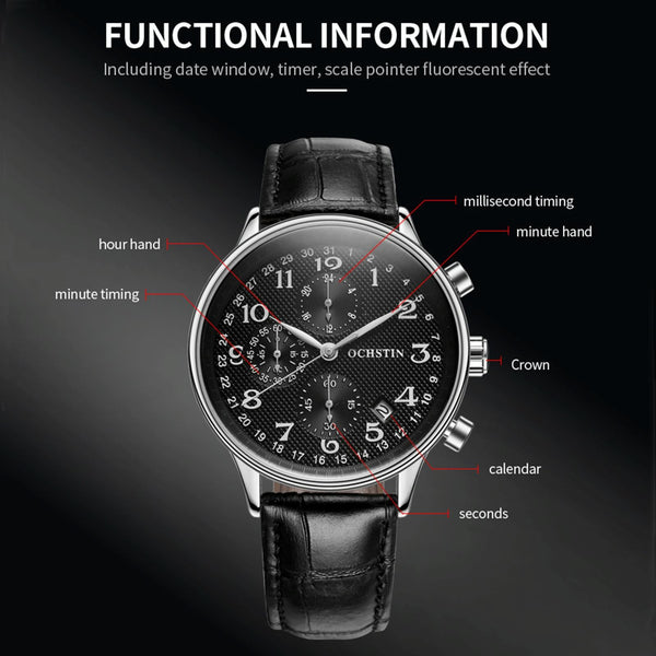 Ochstin 6050C Multifunctional Quartz Men Leather Watch(Silver+Black)