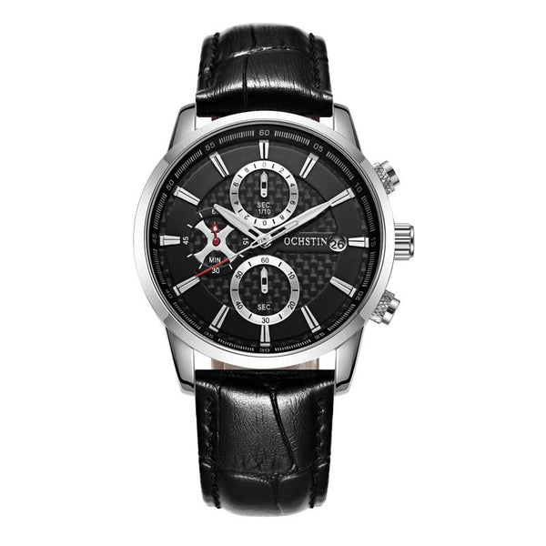 OCHSTIN 6085B Multifunctional Quartz Waterproof Men Leather Watch(Silver+Black)