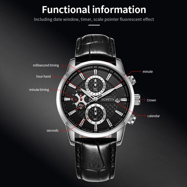 OCHSTIN 6085B Multifunctional Quartz Waterproof Men Leather Watch(Silver+Blue)