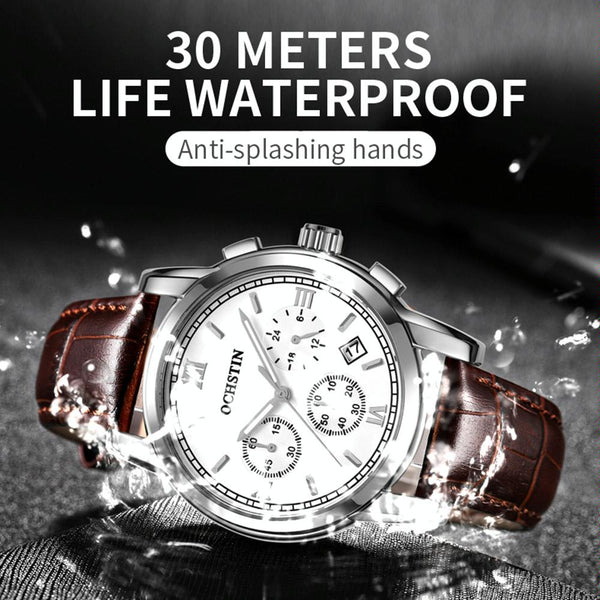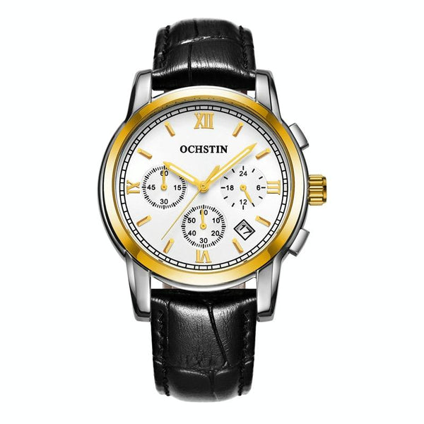 OCHSTIN 6097B Multifunctional Quartz Waterproof Luminous Men Leather Watch(Gold+White+Black)