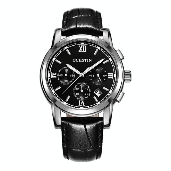 OCHSTIN 6097B Multifunctional Quartz Waterproof Luminous Men Leather Watch(Silver+Black)