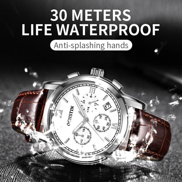 OCHSTIN 6097B Multifunctional Quartz Waterproof Luminous Men Leather Watch(Silver+Coffee)