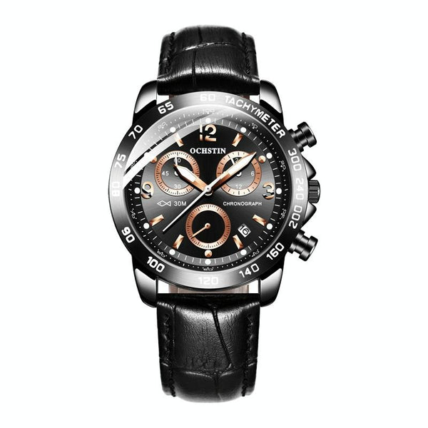 OCHSTIN 6123C Multifunctional Quartz Waterproof Luminous Men Leather Watch(Black 01)