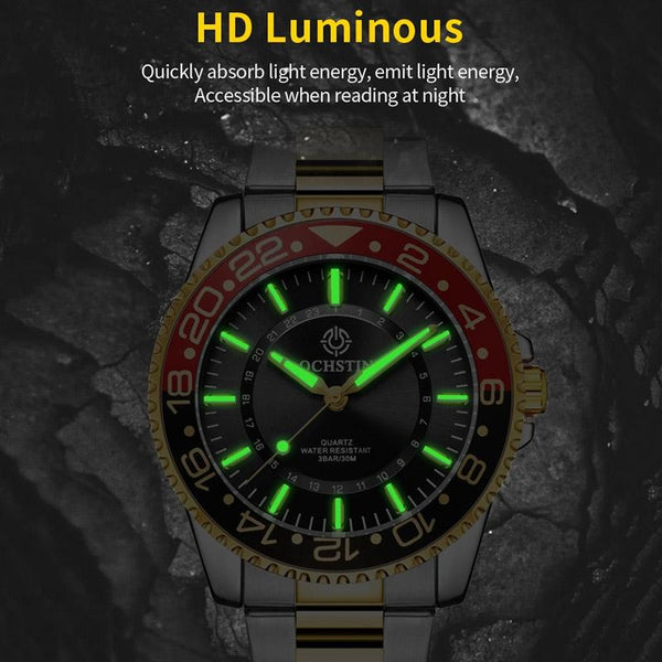 OCHSTIN 7019D Multifunctional Quartz Waterproof Luminous Steel Strap Men Watch(Black+Gold)