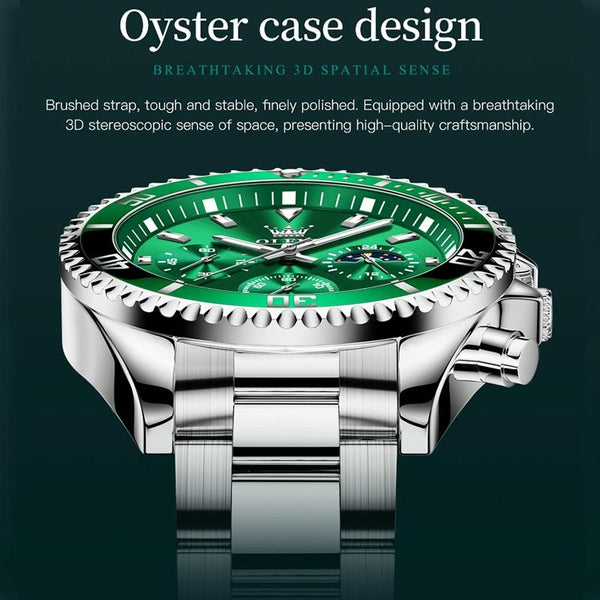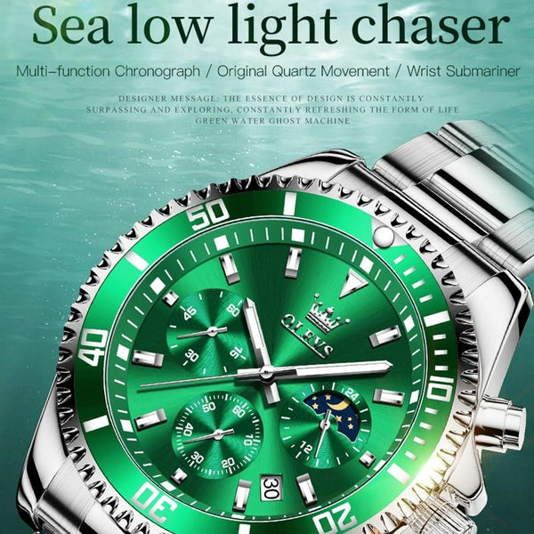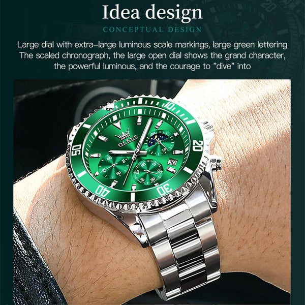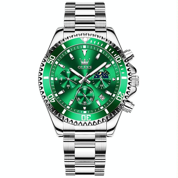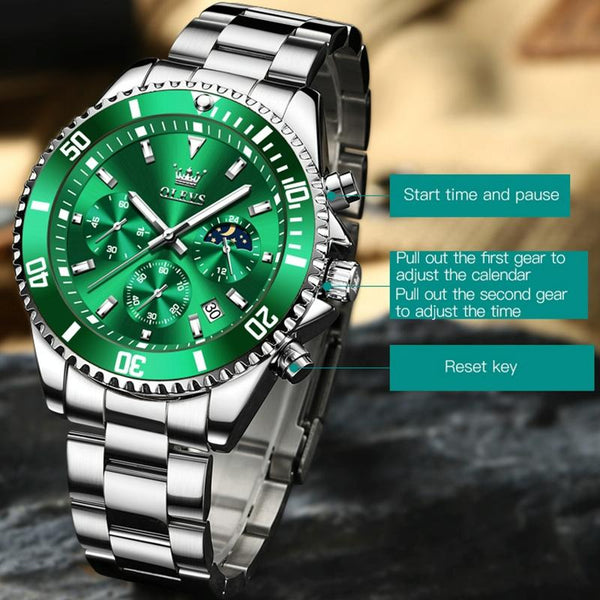 OLEVS 2870 Men Multifunctional Chronograph Three Eyes Waterproof Quartz Watch(Green + Silver)