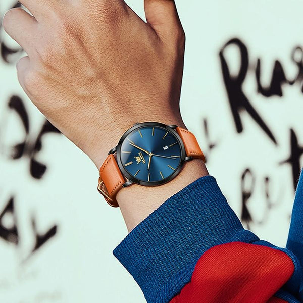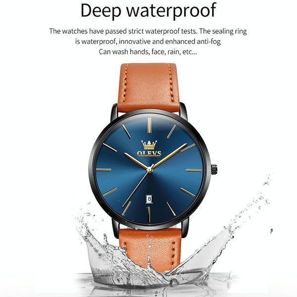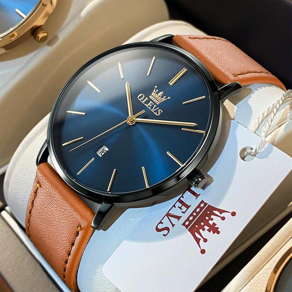 OLEVS 5869 Men Business Waterproof Genuine Leather Strap Quartz Watch(Blue Black Brown)