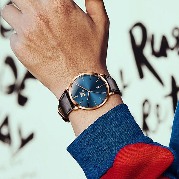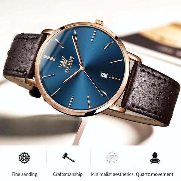 OLEVS 5869 Men Business Waterproof Genuine Leather Strap Quartz Watch(Blue + Rose Gold)