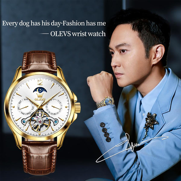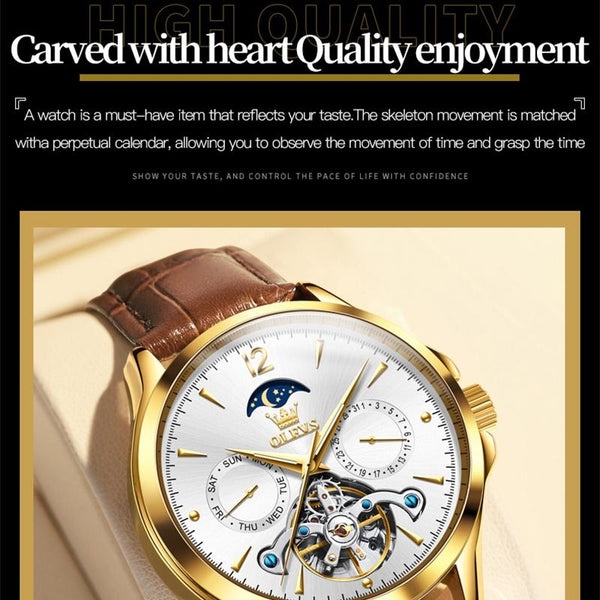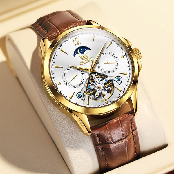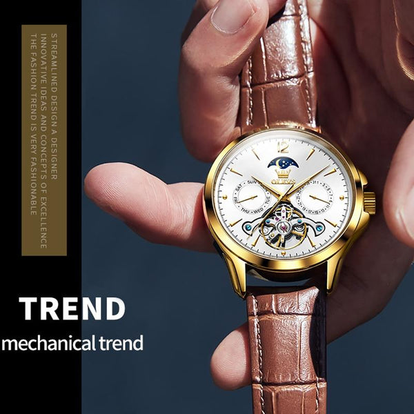 OLEVS 6663 Men Multifunctional Waterproof Hollow Leather Strap Mechanical Watch(White + Brown)
