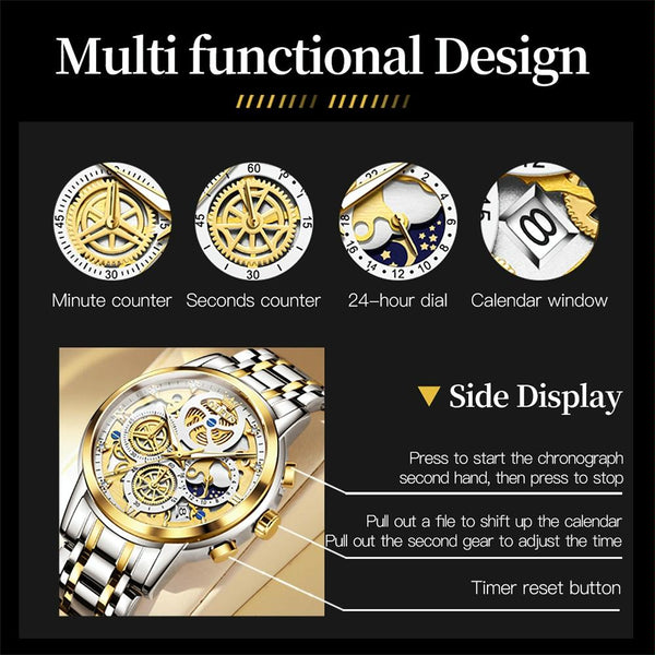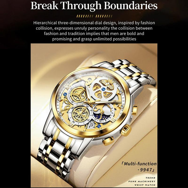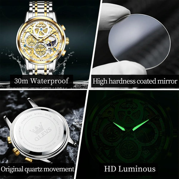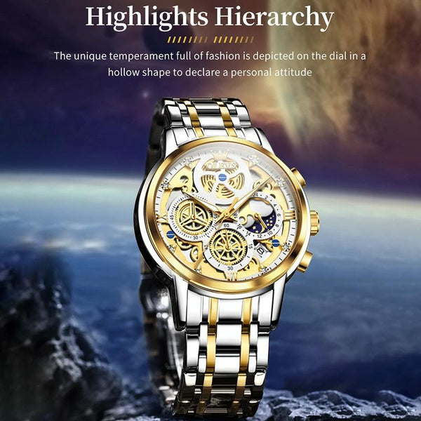 OLEVS 9947 Men Multifunctional Hollow Waterproof Quartz Watch(White + Gold)