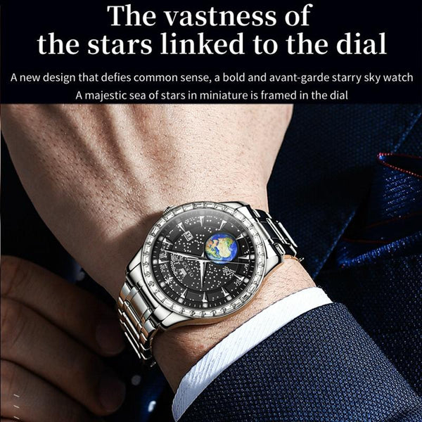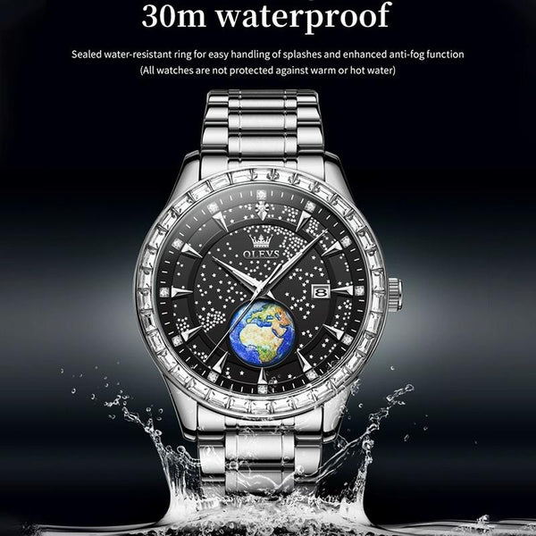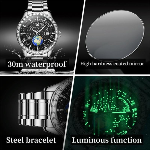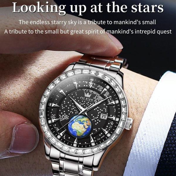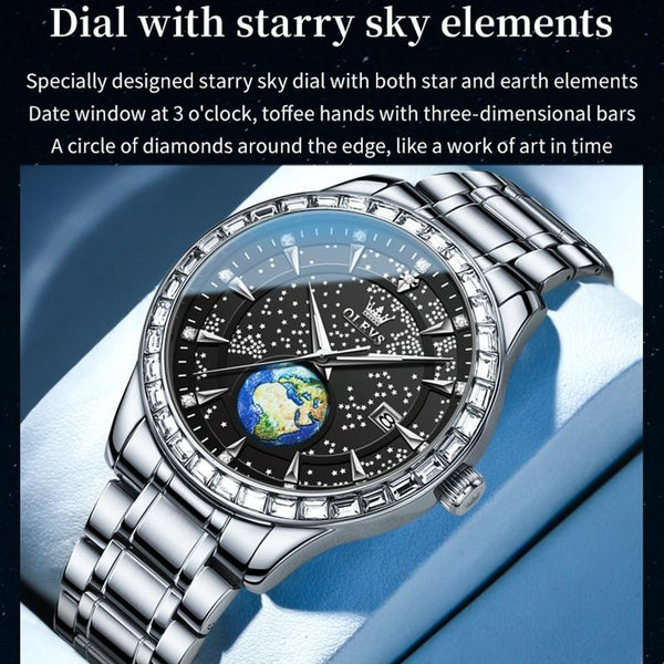 OLEVS 9967 Men Starry Sky Face Diamond Bezel Quartz Watch(Black Steel Strap)