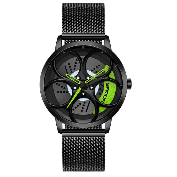 SANDA 1070 3D Oval Hollow Out Wheel Non-rotatable Dial Quartz Watch for Men, Style:Mesh Belt(Black Green)