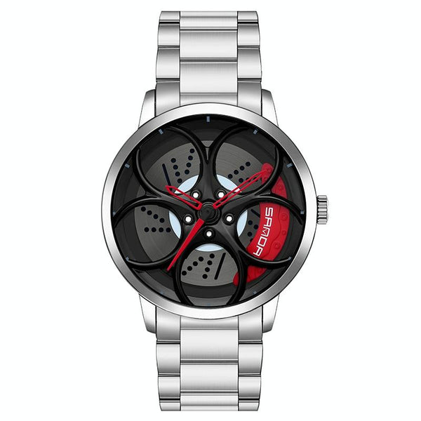 SANDA 1070 3D Oval Hollow Out Wheel Non-rotatable Dial Quartz Watch for Men, Style:Steel Belt(Silver Red)