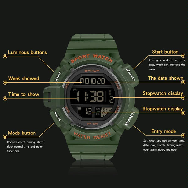 SANDA 2106 LED Digital Display Luminous Alarm Clock Men Outdoor Sports Electronic Watch(Army Green)