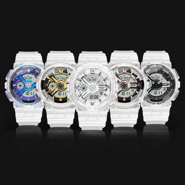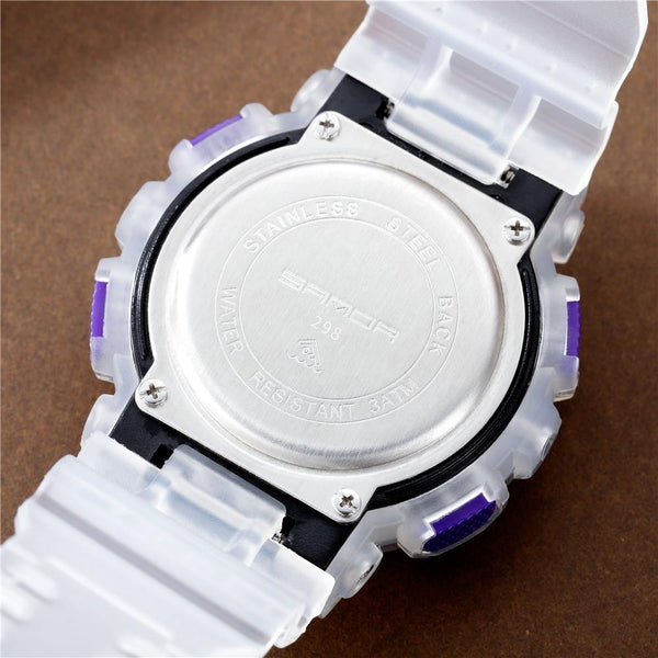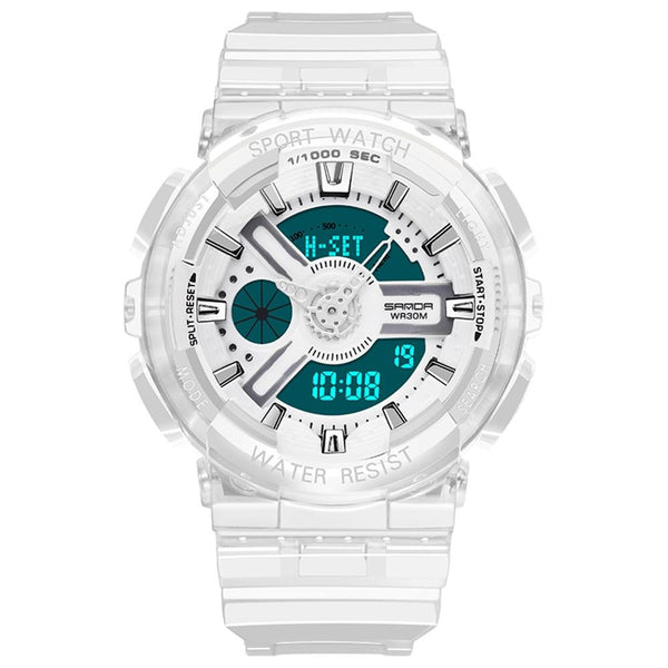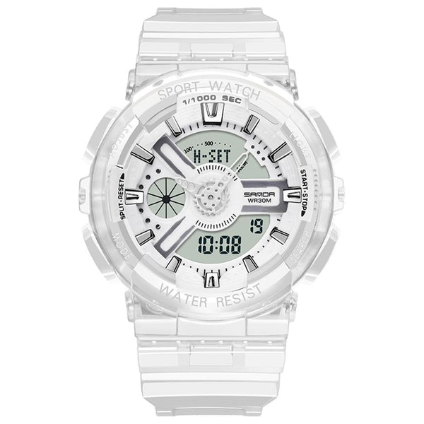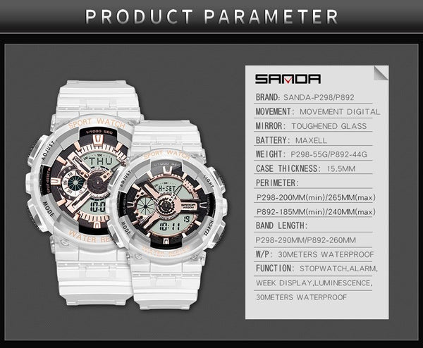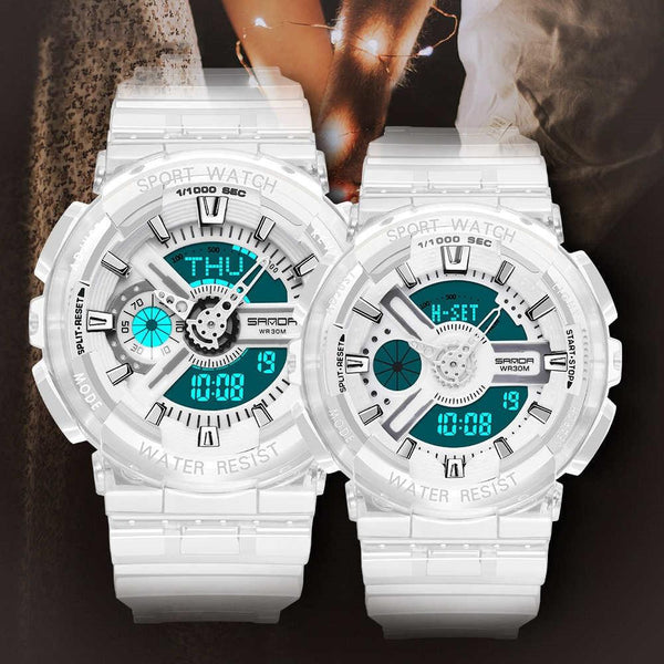 SANDA 298 Watch Men And Women Transparent Watch Waterproof Multi Functional luminous Movement Double Display Couple Electronic Watch(White Woman)