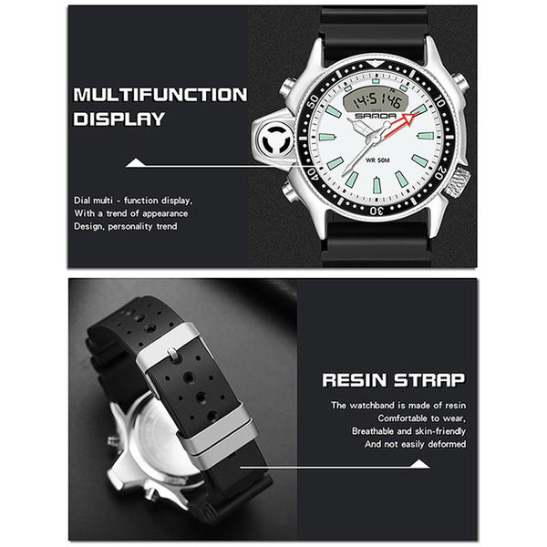 SANDA 3008 Multifunctional Men Outdoor Sports Noctilucent 50m Waterproof Digital Wrist Watch (Black White)