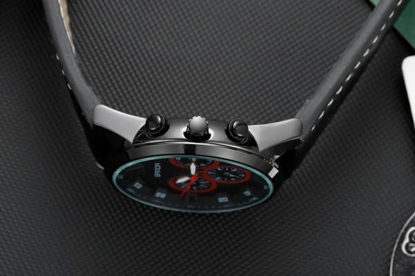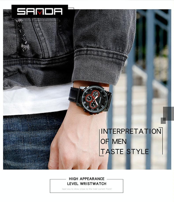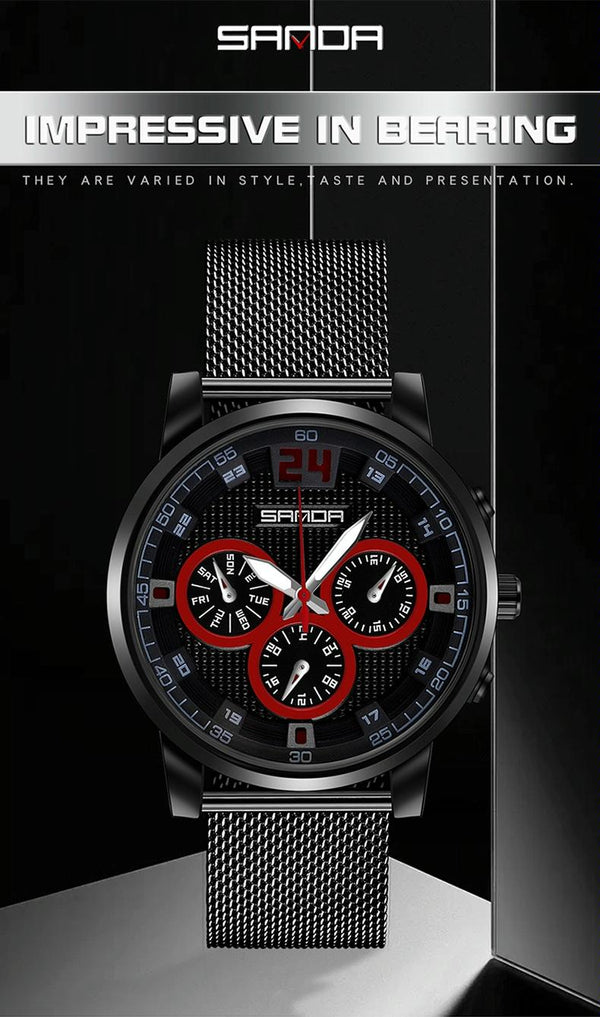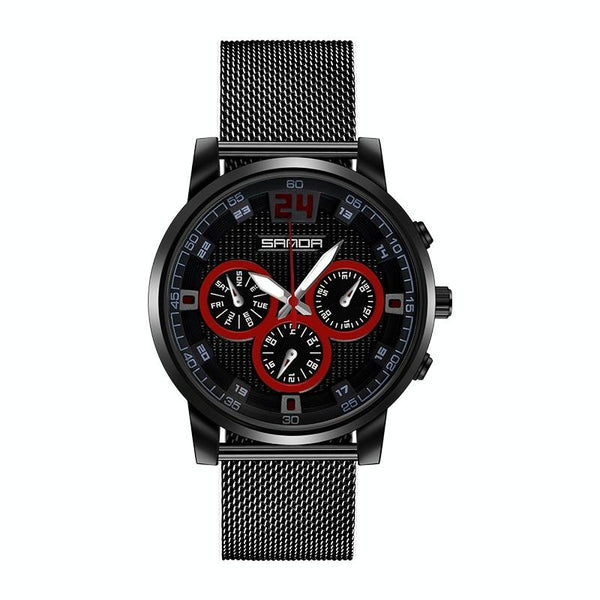 SANDA 5009 Business Fashion Three Eye Six Needle Casual Leather Waterproof Men Quartz Watch(BlackMesh Belt)