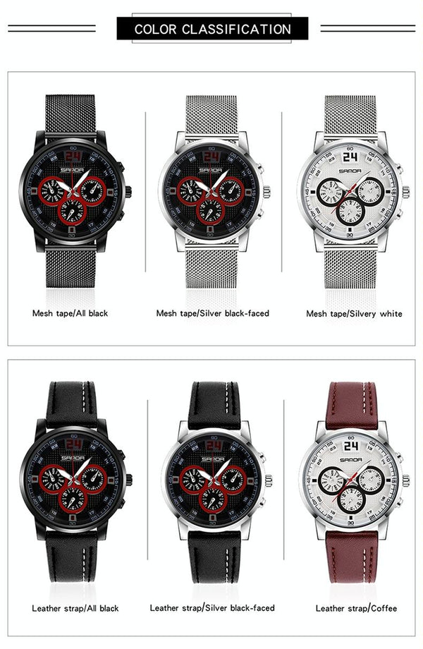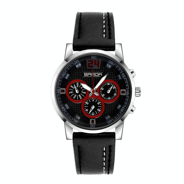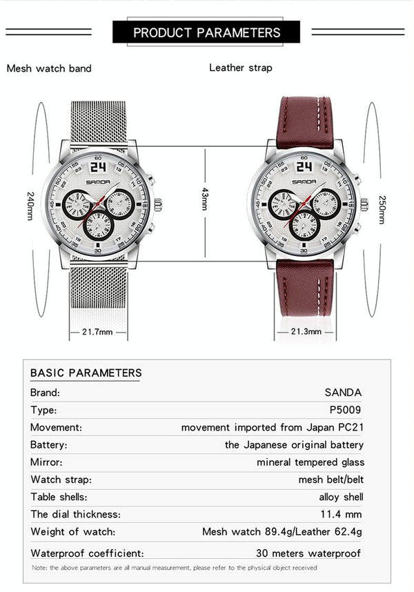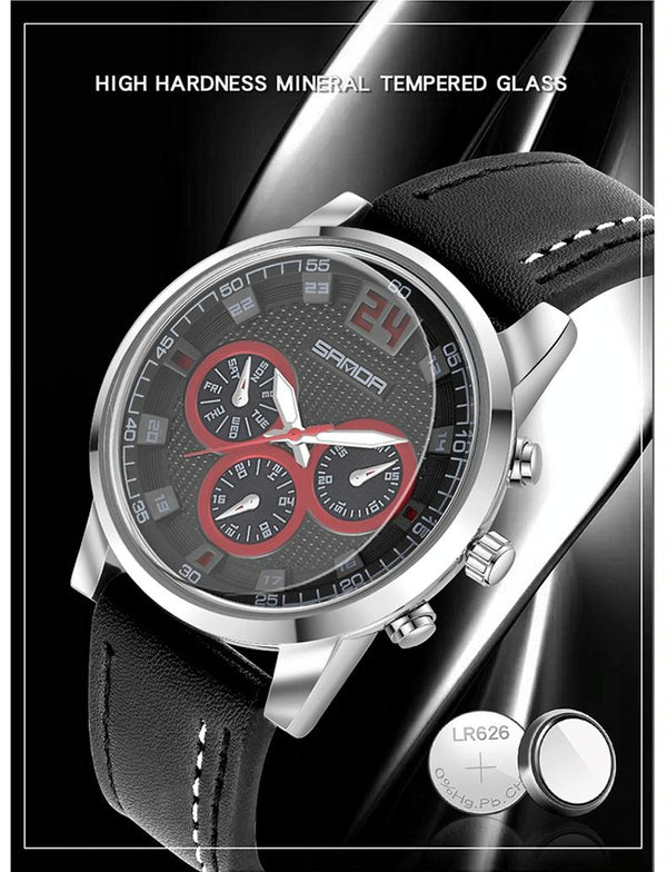SANDA 5009 Business Fashion Three Eye Six Needle Casual Leather Waterproof Men Quartz Watch(Black Silver)