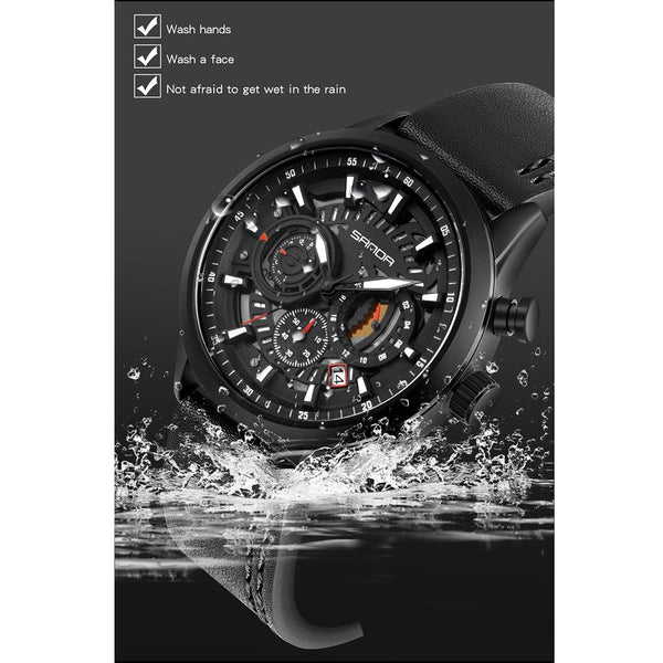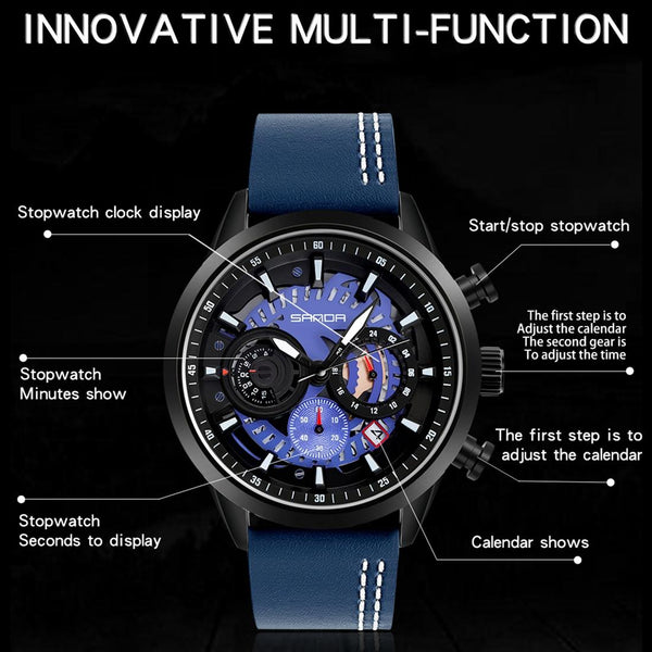SANDA 5010P Six-Pin Cool Big Dial Waterproof Three-Eye Men Watch Leather Strap Fashion Trend Men Watch(Blue)