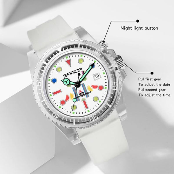 SANDA 6078 Fluorescent Calendar Dial Transparent Strap Quartz Watch for Women(Transparent Black Belt Blue Surface)