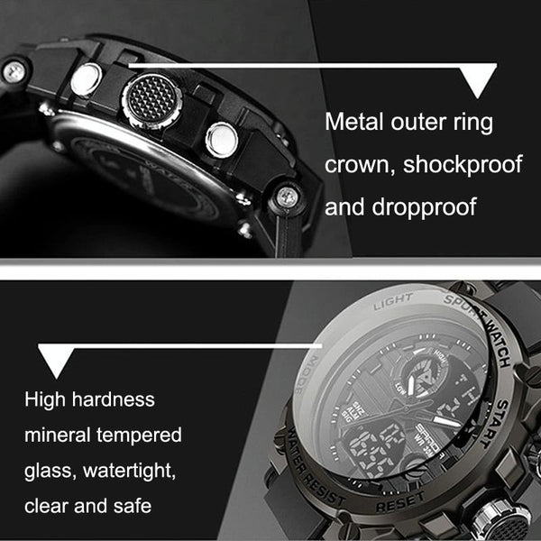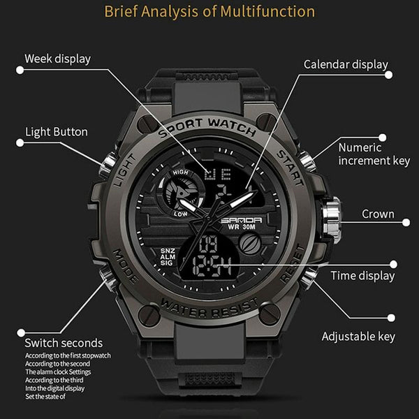 8. Special functions: shockproof and dropproof, 30 meters waterproof, stopwatch timing, dual time, alarm, night light, etc.