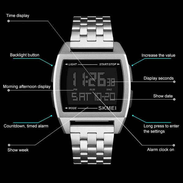 5. Function: stopwatch timing, luminous, display date, timing alarm, countdown, hourly hour