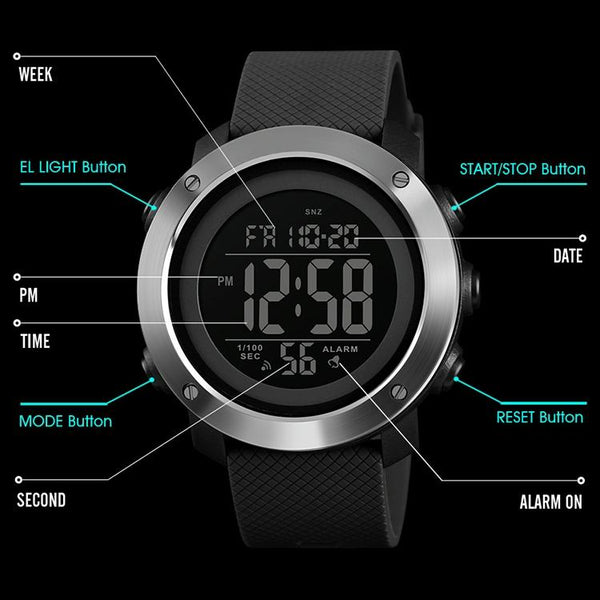 5. Function: dual time display, stopwatch timing, display date, timed alarm, display day, night light, 12/24 hour system, countdown, hourly hour