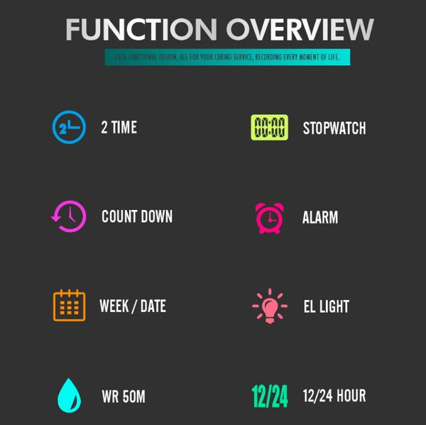 10. Functions: three-time display, stopwatch timing, luminous, date display, day of the week display, timing alarm, hourly hour, 12/24 hour system, countdown