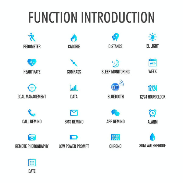 2. Special functions: step counting, compass, weekly display, alarm, chronometer, calendar, heart rate monitoring, sleep monitoring, exercise mileage, calorie calculation, application push, reminder function, data storage, caller reminder, remote photography, Bluetooth function