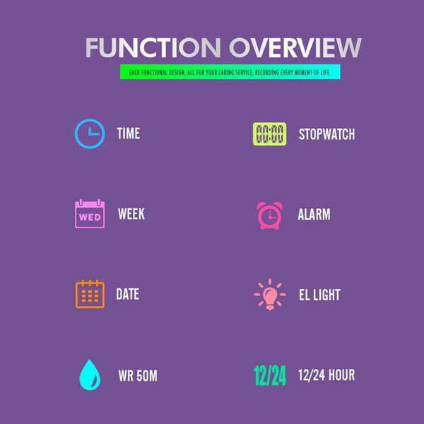7. Functions: time, stopwatch, day and date display, scheduled alarm clock, luminous, 12/24 hour format