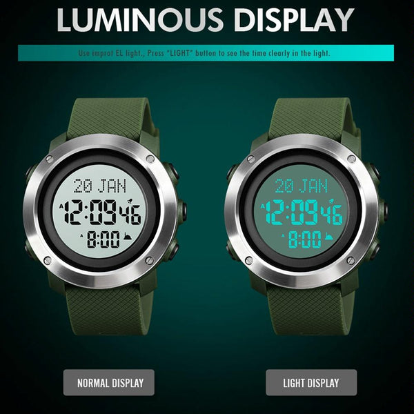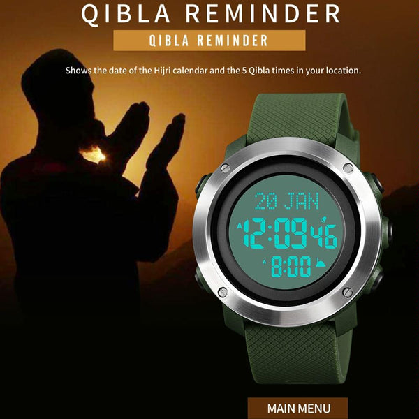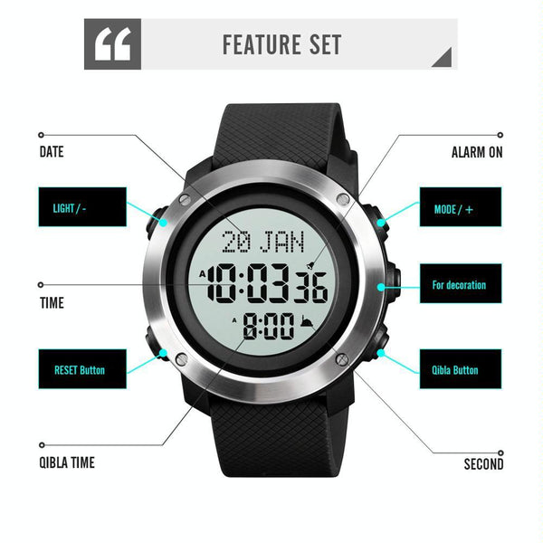 1. Functions: dual time, chronograph stopwatch, countdown, day of the week display, timing alarm clock, night light, 12/24 hour format, prayer time reminder, prayer name display, Qibla direction indication, Qibla direction indication, Gregorian calendar, Hijri calendar, city data, Daylight saving time function, bookmark function, volume adjustment
