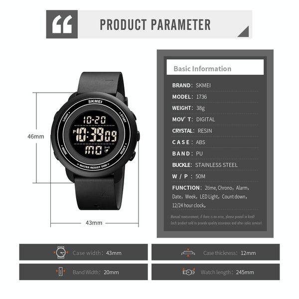8. Functions: two city time, stopwatch timing, LED night light, date display, timing alarm, day of the week display, hourly hour, 12/24 hour system, countdown
