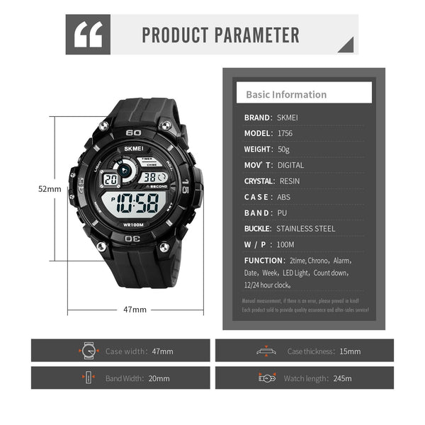8. Functions: dual time, stopwatch timing, luminous, date display, timing alarm, display day of the week, hourly hour, 12/24 hour system, countdown