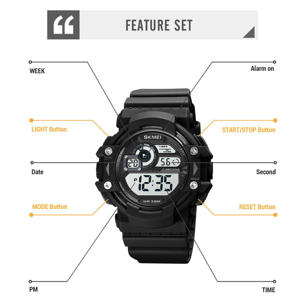 8. Functions: dual time, stopwatch timing, LED night light, date display, timing alarm, day of the week display, hourly hour, 12/24 hour system, countdown
